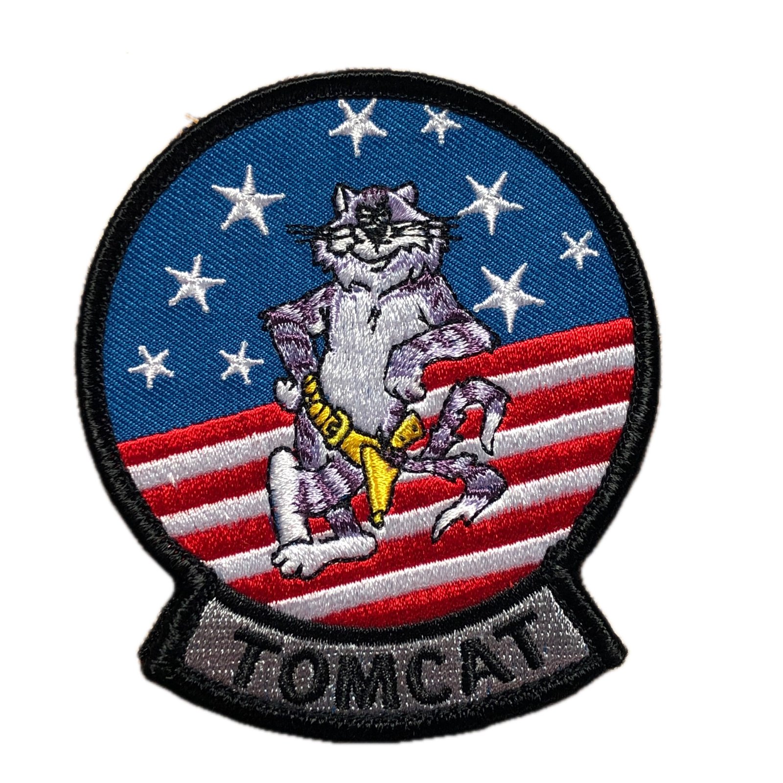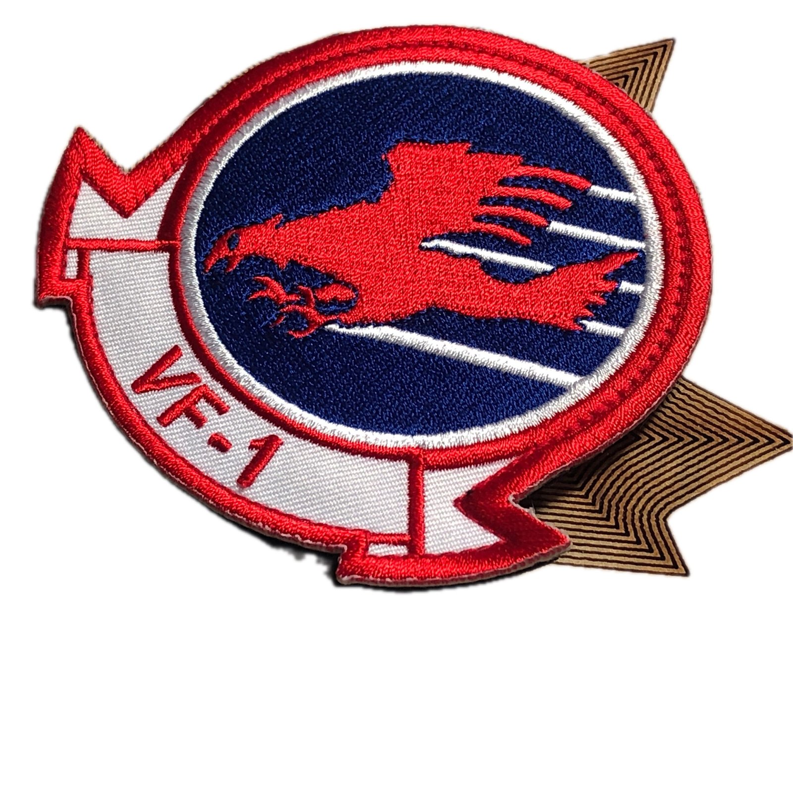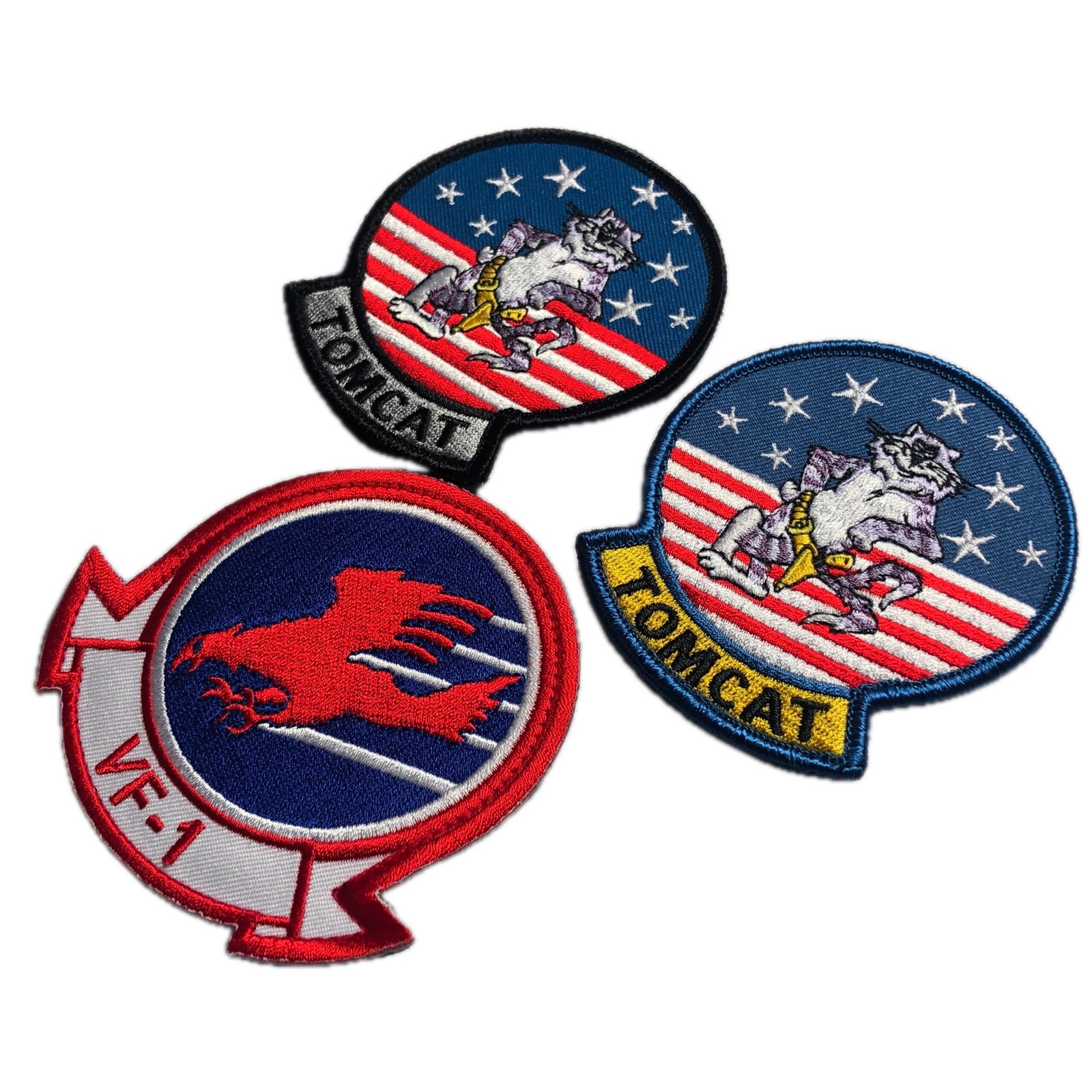 measures 3.5×3 (tomcat) and 3.5×3.5 (vf-1) inches, either iron on or hook and loop backing. Hook fastener is attached to the patch, loop part is provided as well